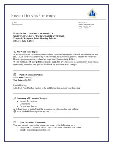 Peekskill Housing Authority – Policy Changes & Public Comment PeriodThe Peekskill Housing Authority (PHA) is proposing updates to its Public Housing policies under the Housing Opportunity Through Modernization Act (HOTMA), effective July 1, 2025.A 45-day public comment period will run from May 14 to June 26, 2025.